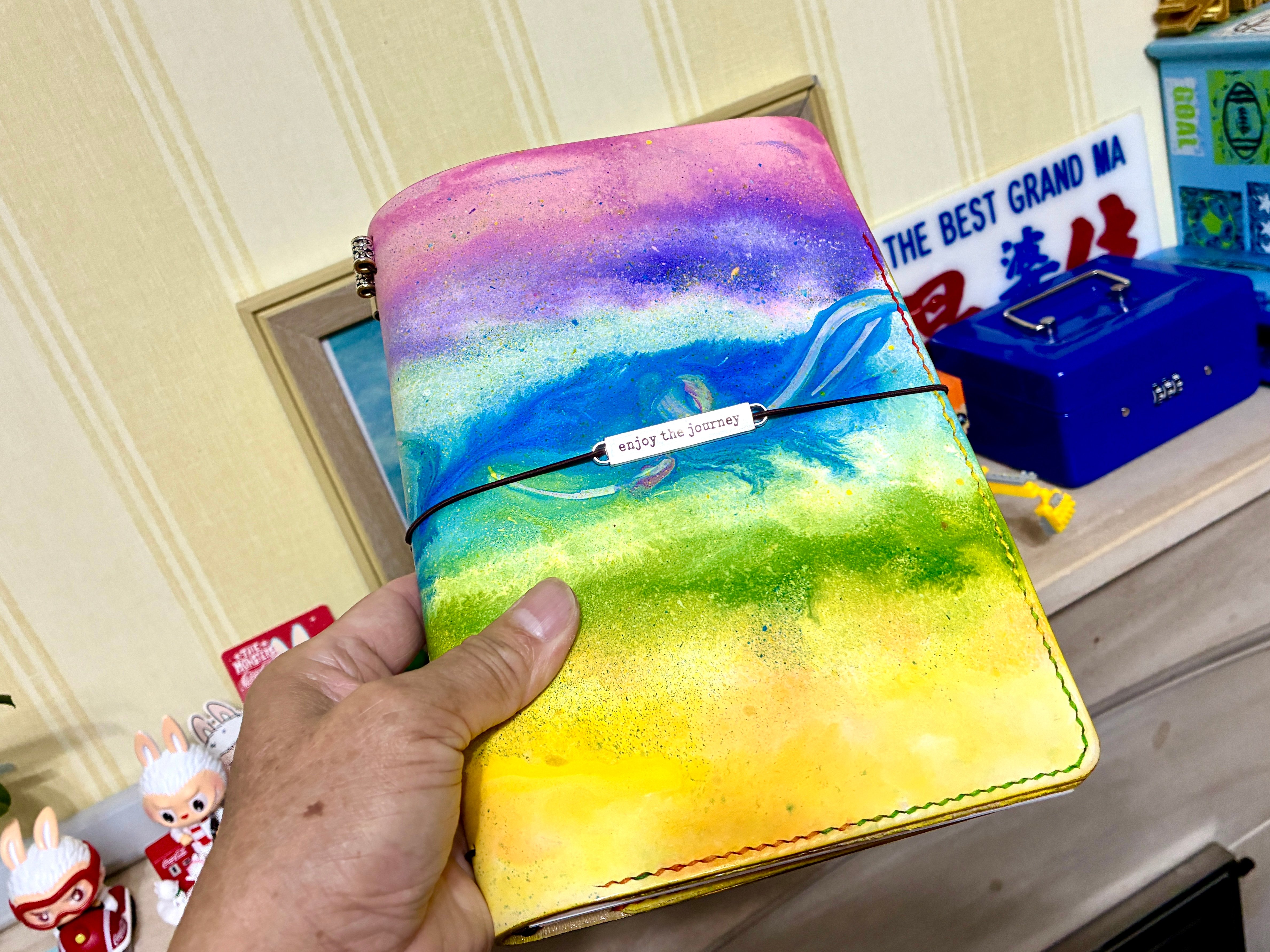 The Signature Collection 22.XXII of Color-sprayed Leather Traveller’s Notebooks & Journals - A5 size extra-thick with hand-stitched inner pockets 。crafted for London Autumn Pen Shows held on 11-12 October 。made in Manchester, United Kingdom 。by Kayztyle Our signature collections of color-sprayed leather traveler's notebooks and journals are renowned for their imaginative, unique patterns and rare craftsmanship. Perfect for keeping a copy for yourself, these journals are ideal companions for every special moment. They also make unique and irresistible gifts for family, close friends, and business colleagues. Design Highlights: 。all sprayed patterns/designs are unique and your imagination is essential to its perfection 。inner leather lining double-sided leather (Khaki)with extra-thick design and hand-stitched pockets 。1 single elastic cord with 6 built-in lined slots design 。2.8-3.0mm thick 。with side-edges protection brass The Package includes: 。leather cover.1 。single line or grid book.1 。blank or kraft blank book.1 。weekly schedule or monthly schedule book.1 。PVC zipped cards holder.1 。metal front nameplate 。charm(complimentary until end December, 2025 and by random ) Opening size : 。A5:22cm H x 33.5cm W 。Standard:22cm H x 27.5cm W 。Handy:18cm H x 24cm W 。Passport:14cm H x 23cm W “Each step feels minor yet crucial, coming together to make it better than expected. 每一步睇落細微,但其實好關鍵,合埋一齊之後,令成件事比預期更好。” We are….. Kayztyle.其一文創 your new brand of hand-crafted leather journals Delivery Options: 。free local delivery for order of leather journals 。available for international delivery (check with us) 。select type of delivery options at check-out YouTube: https://www.youtube.com/@kayztyle First listing:2-10-2025